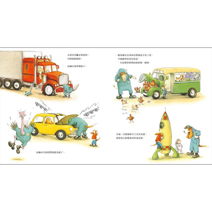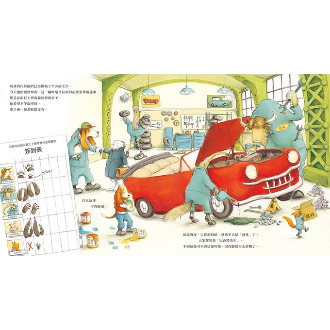 跟著小狗迪倫踏入爸爸的汽車修理廠,忙碌的一天開始啦!客人送來修理的車子有著不同的狀況,像是爆胎、警報器失靈,甚至有身體龐大的客人不小心坐到車頂上,把車子壓壞呢!面對各種棘手複雜的問題,汽修師可得仔細分析問題,動動腦想出解決辦法。而遇到大事件的時候,比如說癱瘓交通的超級大塞車,就需要大家通力合作、齊心解決!汽修店的夥伴各司其職:有人換輪胎,有人給水箱加水,有人檢查汽油狀況,有人用扳手敲敲打打,還有人發送冰淇淋安撫大家的心情!