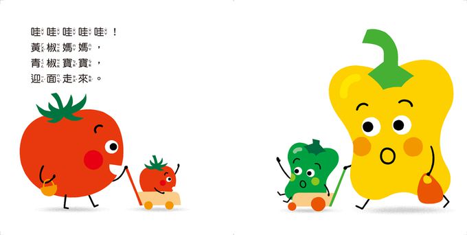選用常見的蔬菜水果搭配基本的家族成員,在聽故事之餘,還能認識蔬果名稱和家庭稱謂。