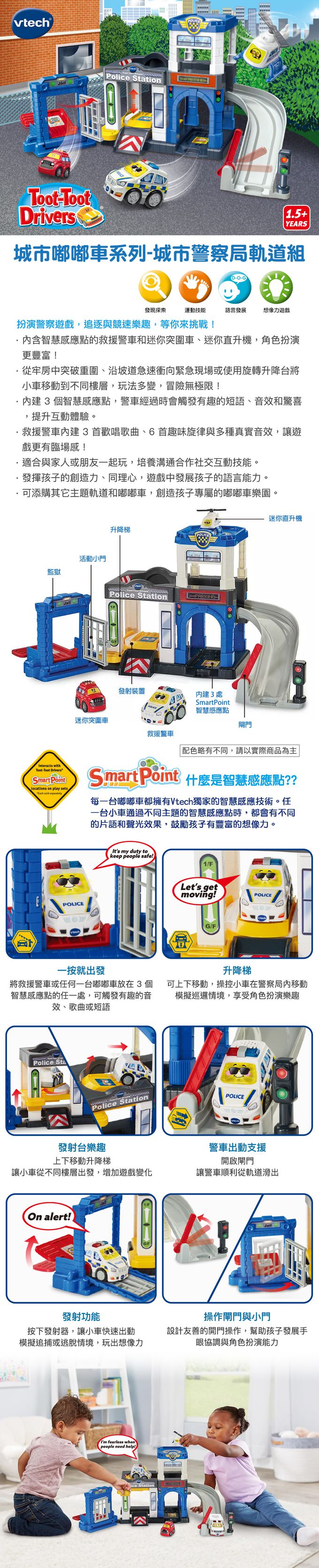 ‧軌道組上的 3 個智慧感應點,警車經過時會觸發有趣的短語、音效和互動驚喜!強化互動式遊戲體驗與語言學習。