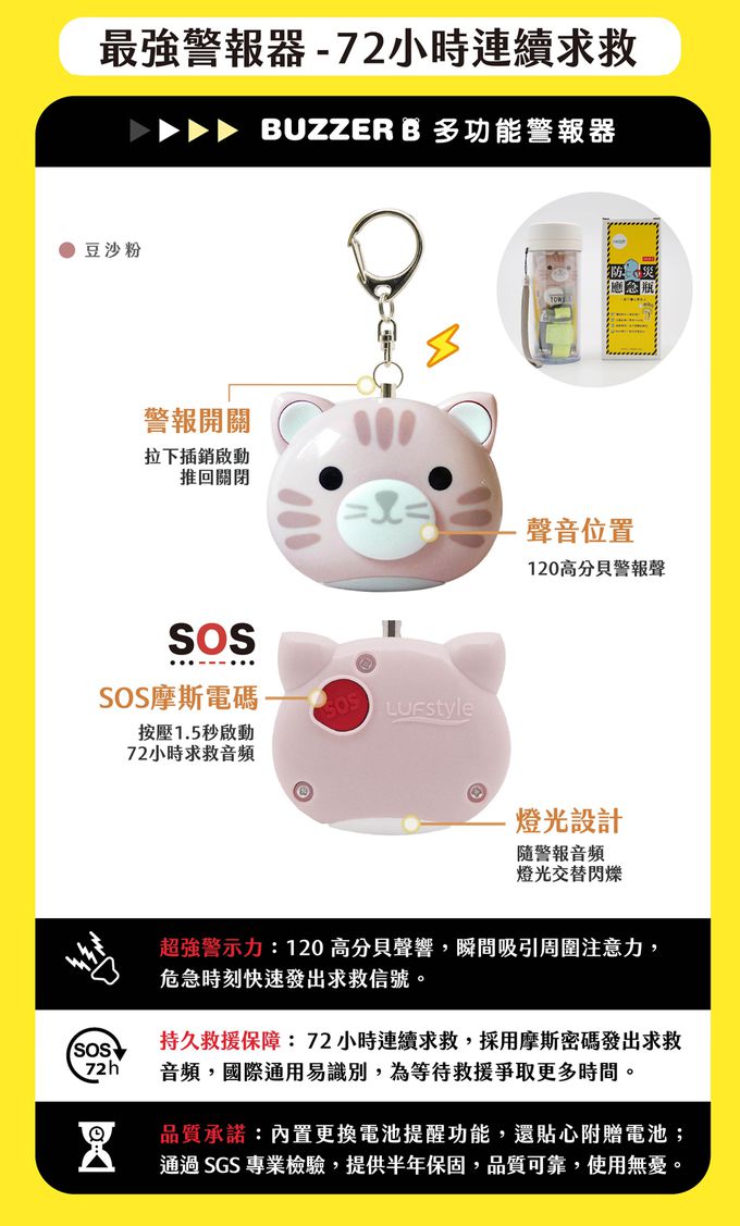 ( 水瓶 ×1、雨衣<顏色隨機> ×1、手電筒 ×1、鋁箔保暖毯 ×1、壓縮毛巾 ×1、哨子 ×1、防災手冊 ×1、掛繩<顏色隨機> ×1、反光黏扣帶<顏色隨機> ×1、BUZZER B警報器 ×1 )