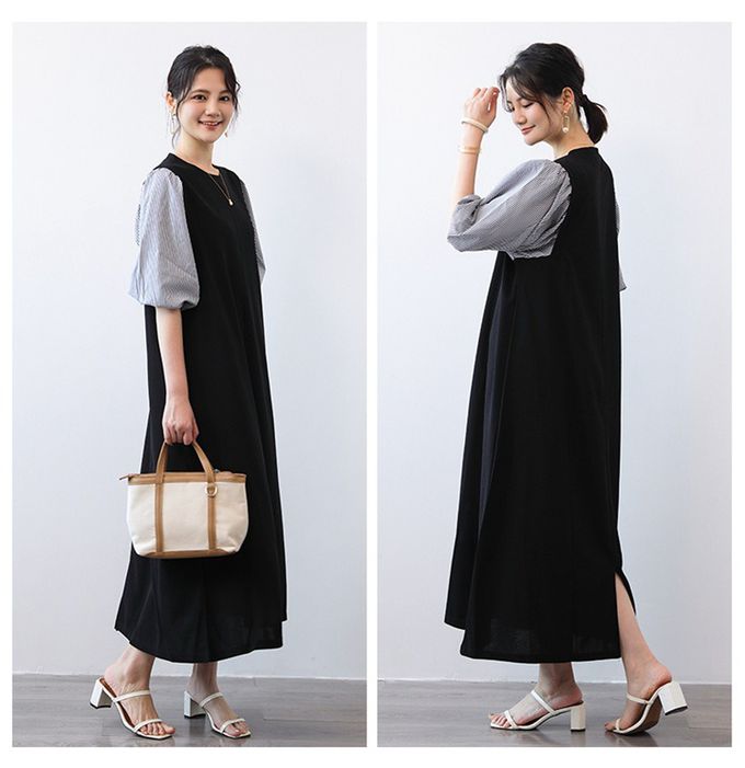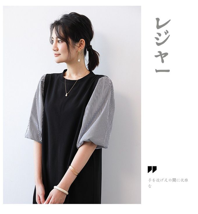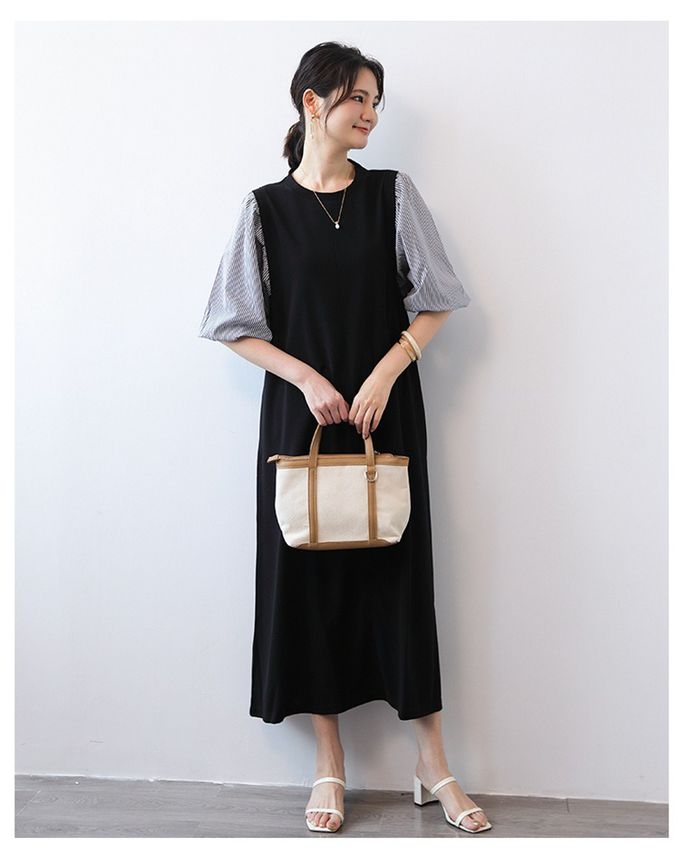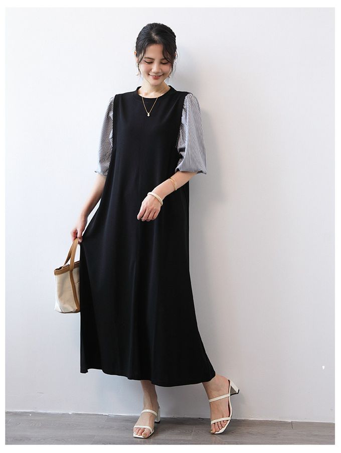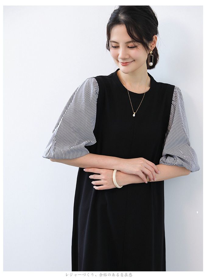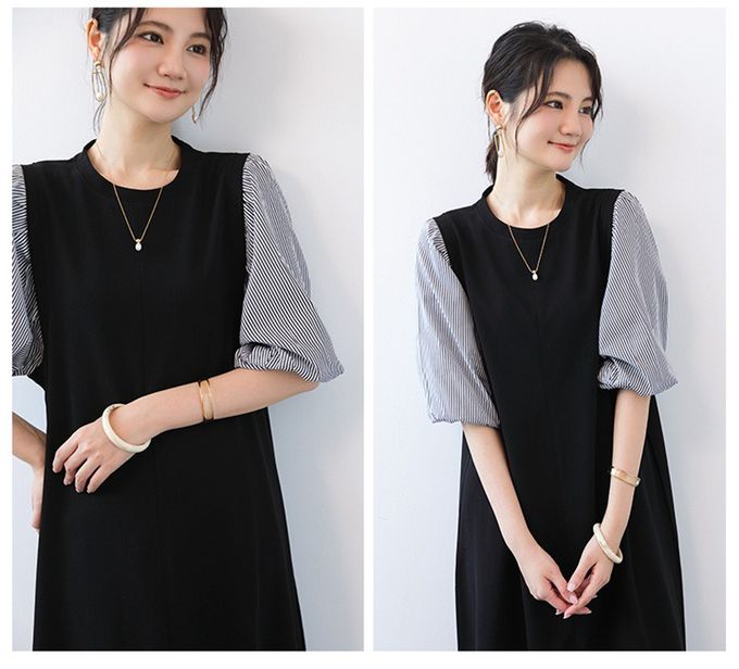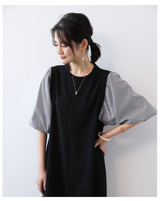 Yukié - 日系拼接假兩件泡泡袖洋裝-黑白條紋