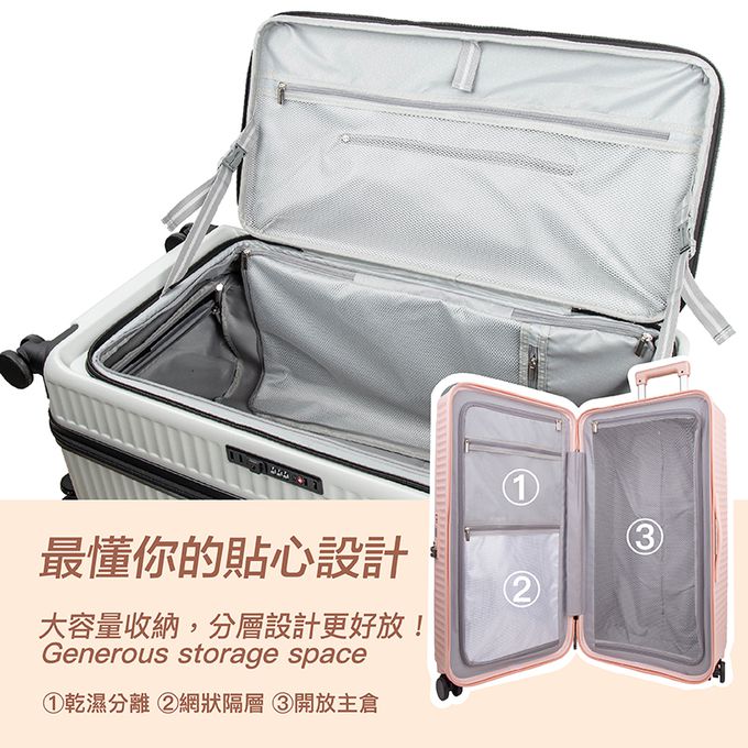 一般行李箱開蓋後東西常常亂成一團。但這咖主打超能裝+雙開式:讓空間分配更有秩序,出國帶很多伴手禮也不怕塞不下!