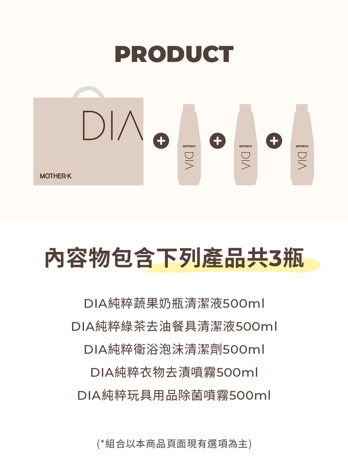 衛浴泡沫清潔劑*2+衣物去漬噴霧*1、蔬果奶瓶清潔液*2+衣物去漬噴霧*1、蔬果奶瓶清潔液*1+衣物去漬噴霧*1+玩具用品除菌噴霧*1、蔬果奶瓶清潔液*1+衣物去漬噴霧*1+衛浴泡沫清潔劑*1、蔬果奶瓶清潔液*3、蔬果奶瓶清潔液*2+玩具用品除菌噴霧*1