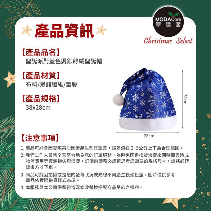 品名:耶誕-聖誕派對藍色燙銀絲絨聖誕帽