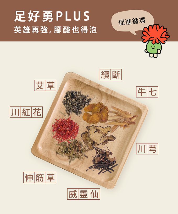 [足好勇PLUS]成分:川芎、伸筋草、艾草、川紅花、續斷、牛七、威靈仙、甘胺酸鎂