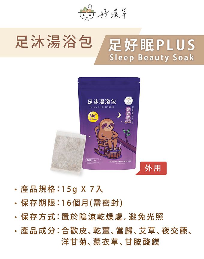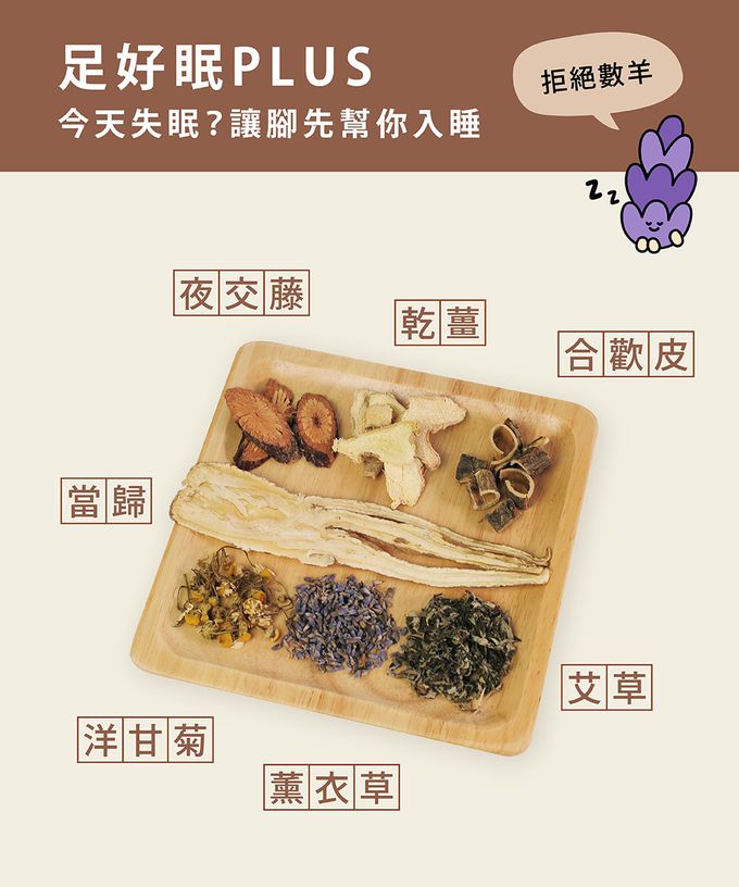 [足好眠PLUS]成分:合歡皮、乾薑、當歸、艾草、夜交藤、洋甘菊、薰衣草、甘胺酸鎂