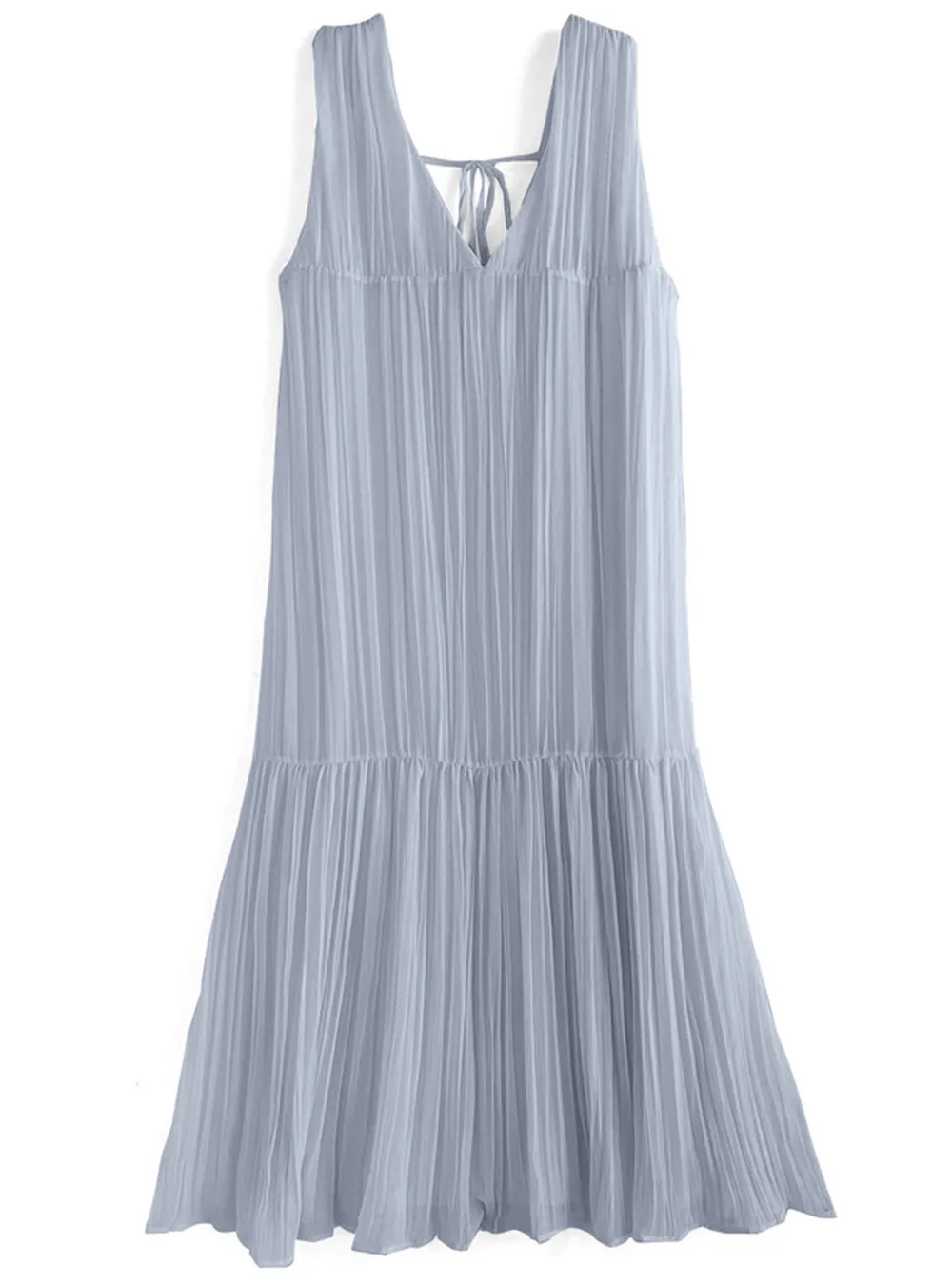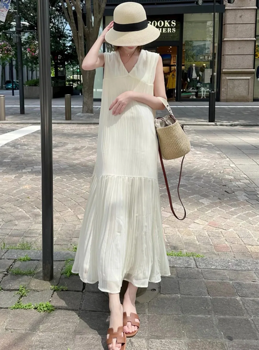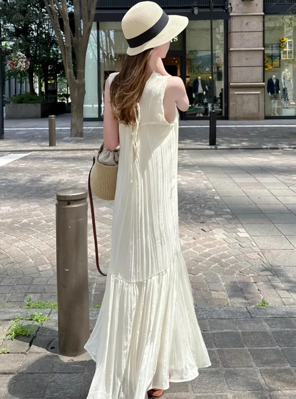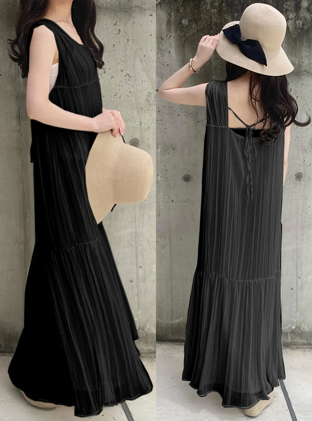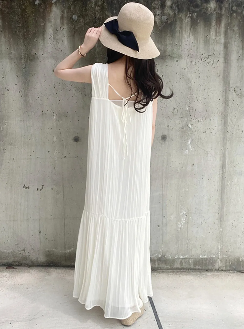 • 品名:柔美雪紡後綁帶細摺背心洋裝