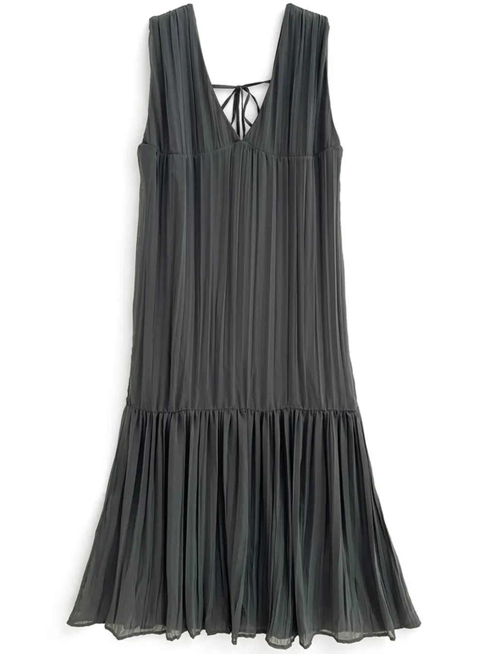 日本 GRL - 柔美雪紡後綁帶細摺背心洋裝-炭灰 (F)
