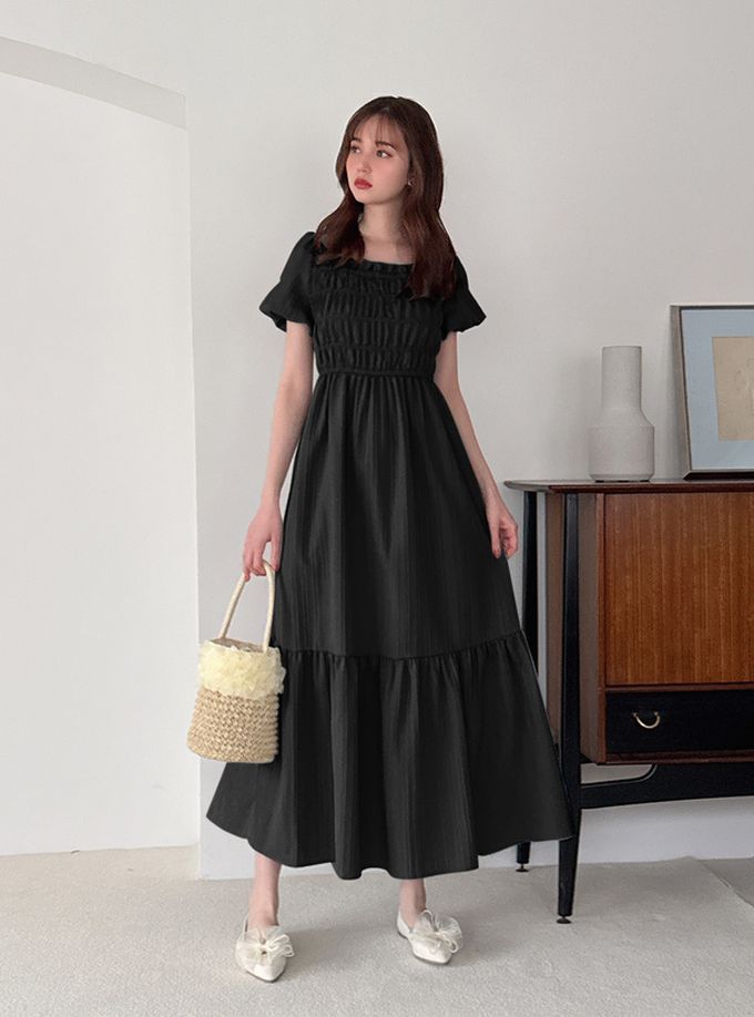 • 品名:柔和方領皺摺線條紋理泡泡袖洋裝