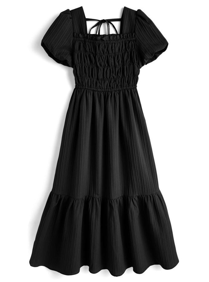 日本 GRL - 柔和方領皺摺線條紋理泡泡袖洋裝-黑 (F)