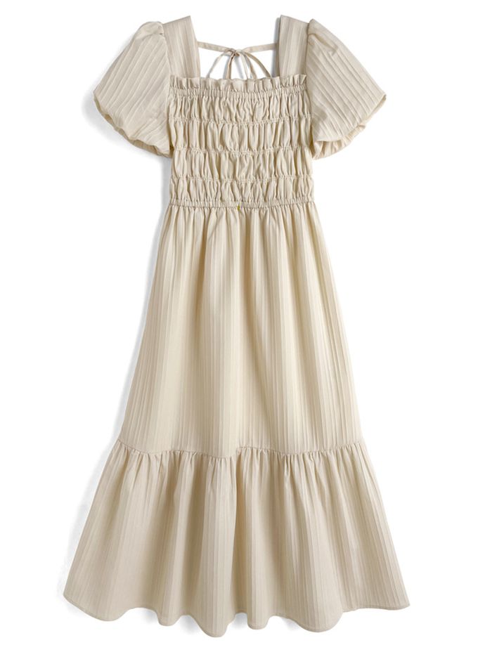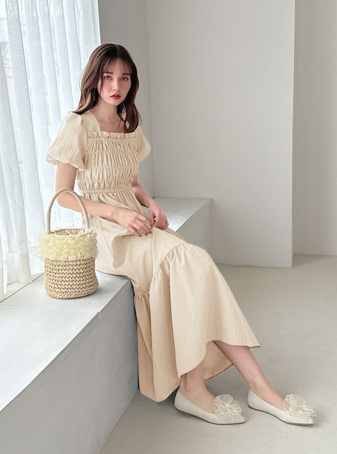 • 品名:柔和方領皺摺線條紋理泡泡袖洋裝