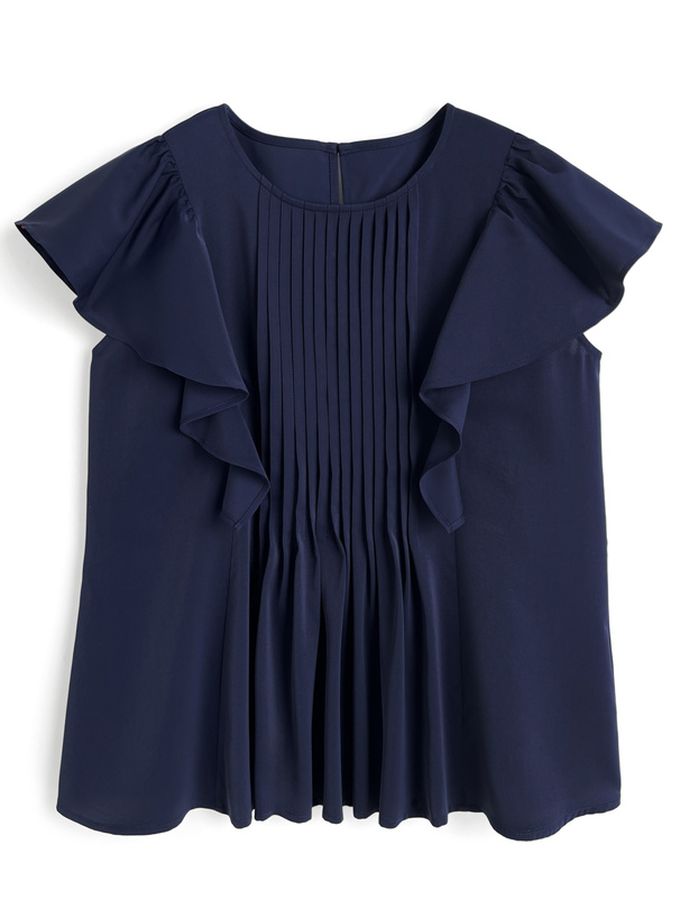 日本 GRL - 氣質線條圓領荷葉短袖上衣-海軍藍 (F)