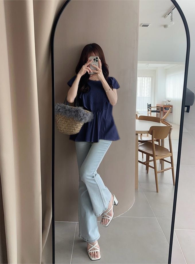• 品名:氣質線條圓領荷葉短袖上衣