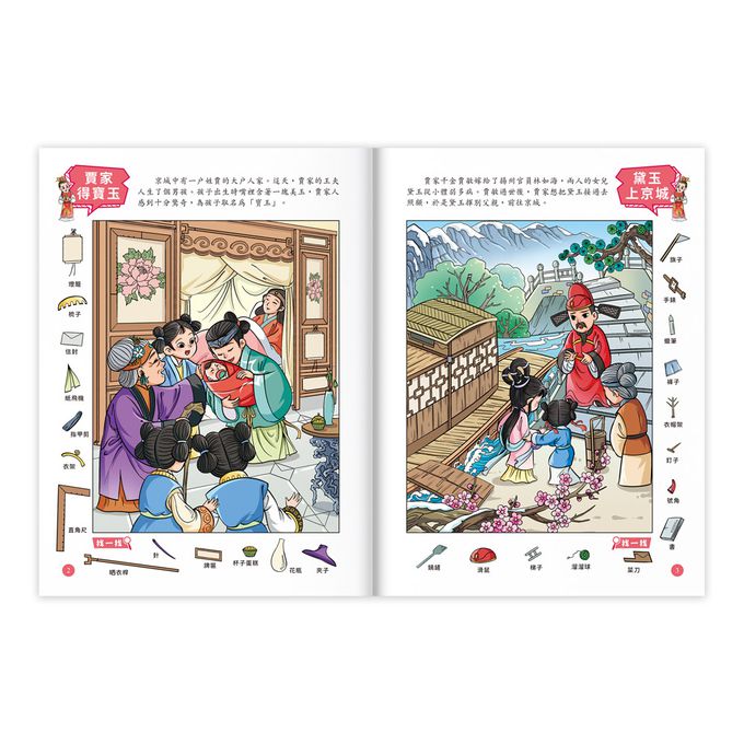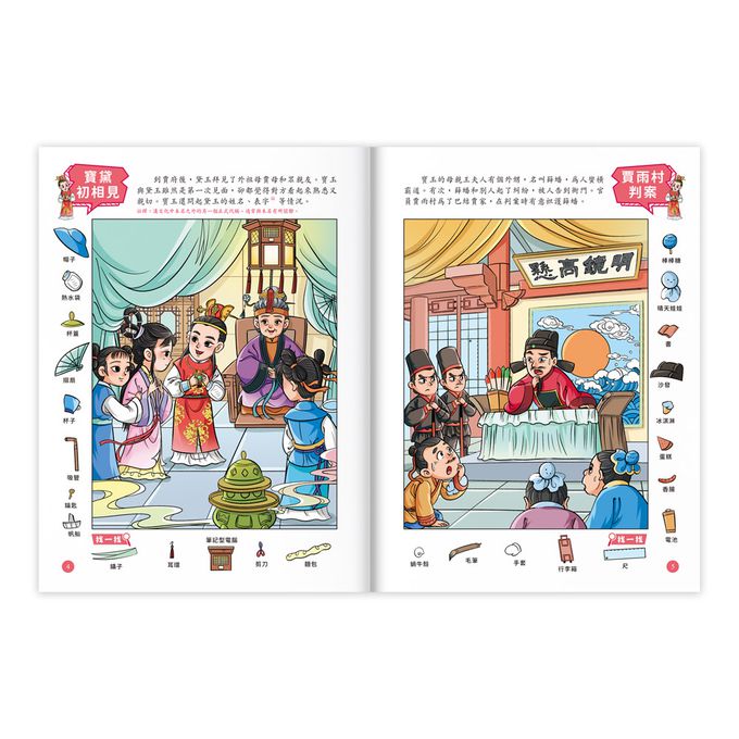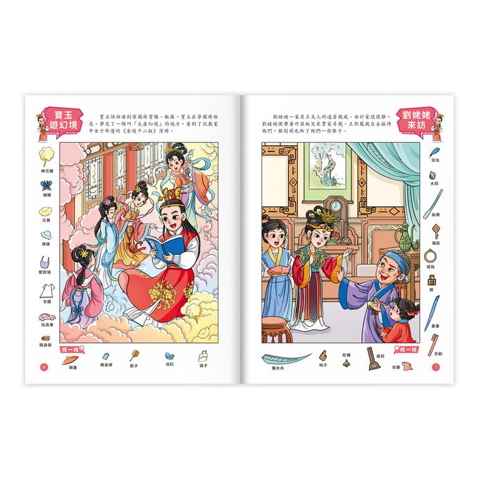 動腦又動眼的觀察大冒險!《1000題四大名著 觀察大挑戰-紅樓夢》將四大名著中的紅樓夢以簡單又易懂的故事內容呈現,並利用觀察找一找的小遊戲讓孩子邊閱讀邊遊戲玩耍,不僅培養閱讀能力與國學素養,同時訓練孩子的眼力、觀察力、專注力、邏輯思維與反應能力,每一頁都是一幅熱鬧場景,讓人目不轉睛,愛不釋手!