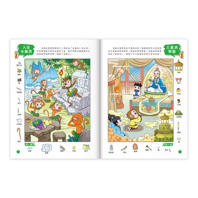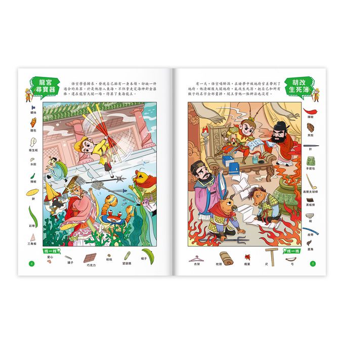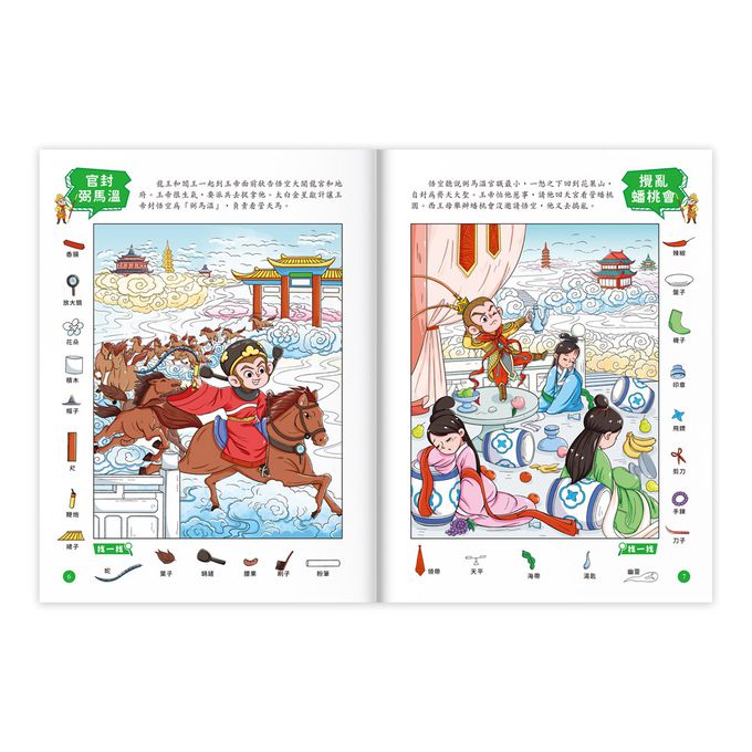 動腦又動眼的觀察大冒險!《1000題四大名著 觀察大挑戰-西遊記》將四大名著中的西遊記以簡單又易懂的故事內容呈現,並利用觀察找一找的小遊戲讓孩子邊閱讀邊遊戲玩耍,不僅培養閱讀能力與國學素養,同時訓練孩子的眼力、觀察力、專注力、邏輯思維與反應能力,每一頁都是一幅熱鬧場景,讓人目不轉睛,愛不釋手!