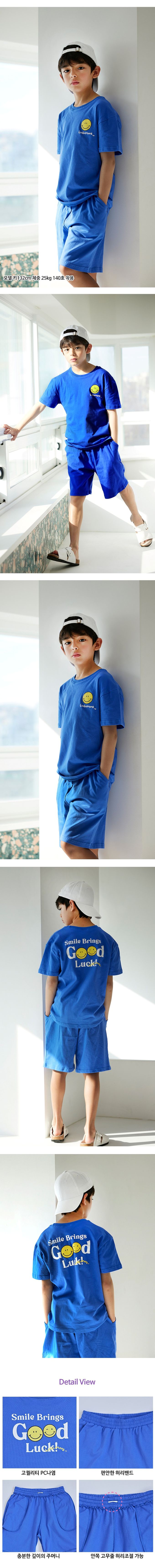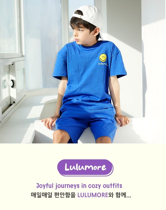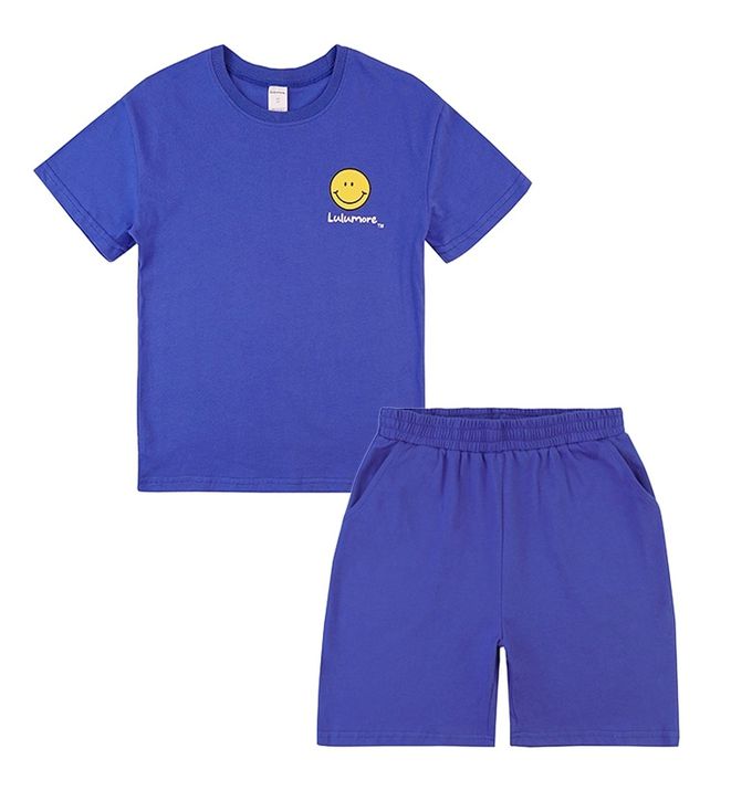 韓國 Lulumore - 舒適純棉短袖套裝-黃笑臉-寶藍