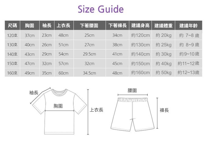 1. 尺寸表單位皆為公分(cm),實際尺寸會因布料彈性、水洗、測量起迄點等因素略有誤差。建議參考孩子平時穿著衣物尺寸進行選購。