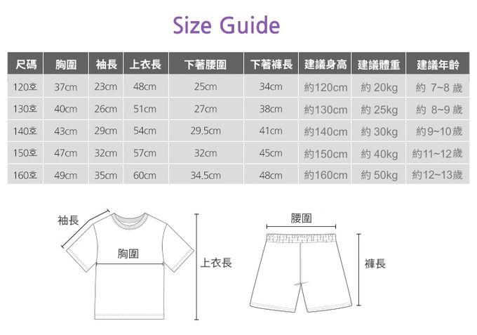 1. 尺寸表單位皆為公分(cm),實際尺寸會因布料彈性、水洗、測量起迄點等因素略有誤差。建議參考孩子平時穿著衣物尺寸進行選購。