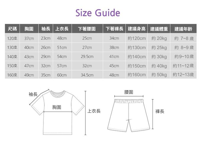 1. 尺寸表單位皆為公分(cm),實際尺寸會因布料彈性、水洗、測量起迄點等因素略有誤差。建議參考孩子平時穿著衣物尺寸進行選購。