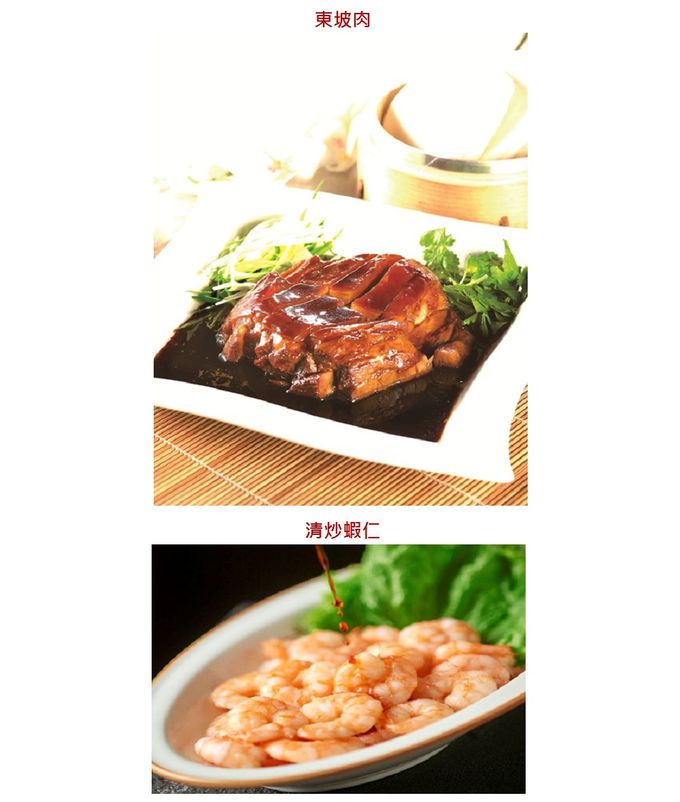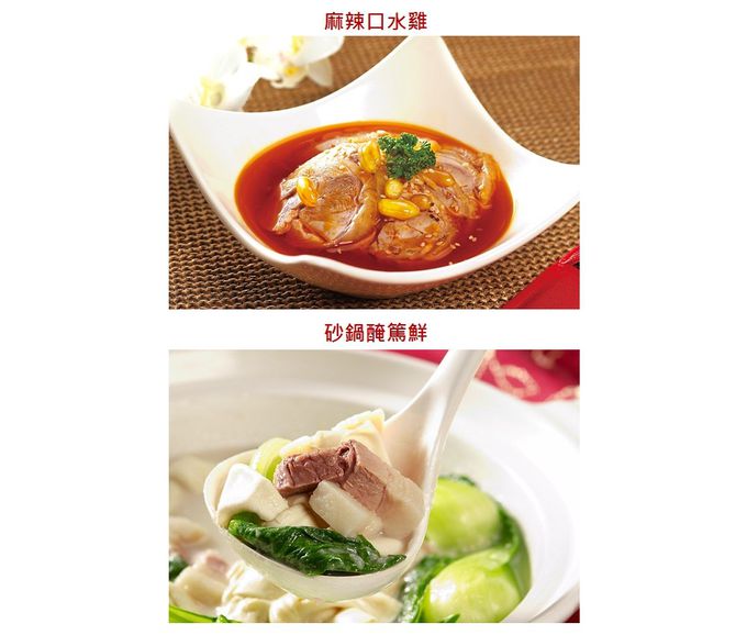 餐點內容:麻辣口水雞+清炒蝦仁+東坡肉+刈包4份+干鍋嫩雞+清炒豆苗+上海砂鍋菜飯+砂鍋醃篤鮮+蝦仁燒賣+芝麻酒釀湯圓。