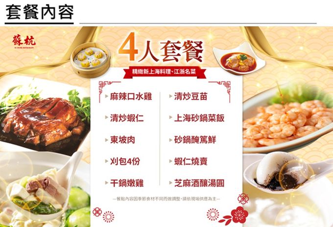 1.單張券可4人於蘇杭餐廳適用分店享用四人套餐。(已含服務費)