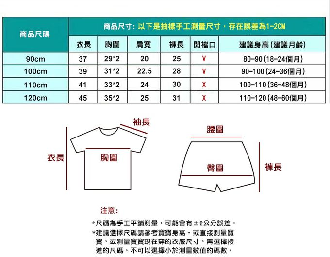 【適用年齡】圖例中都有平鋪實量尺寸表,建議拿一件孩子的衣服篩選比對