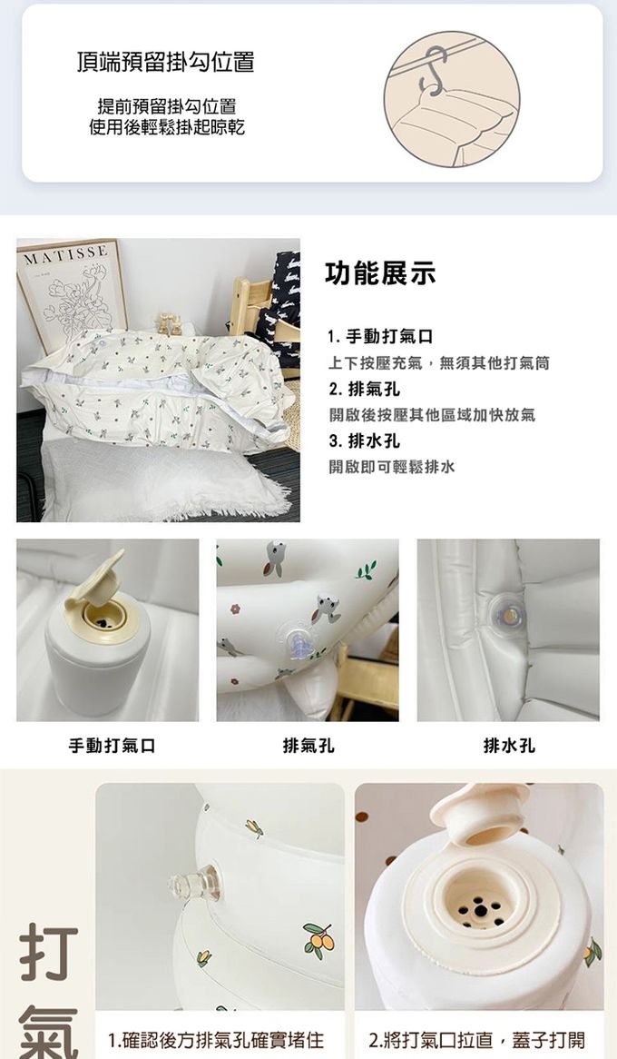1.使用前須先檢查是否有無破損,再將排氣孔關閉後再打開打氣泵孔蓋,上下按壓灌氣即可。