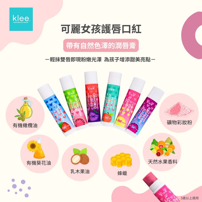 成分:有機橄欖油、有機葵花籽油、乳木果油、蜂蠟、維生素E、天然水果香料、礦物彩妝粉