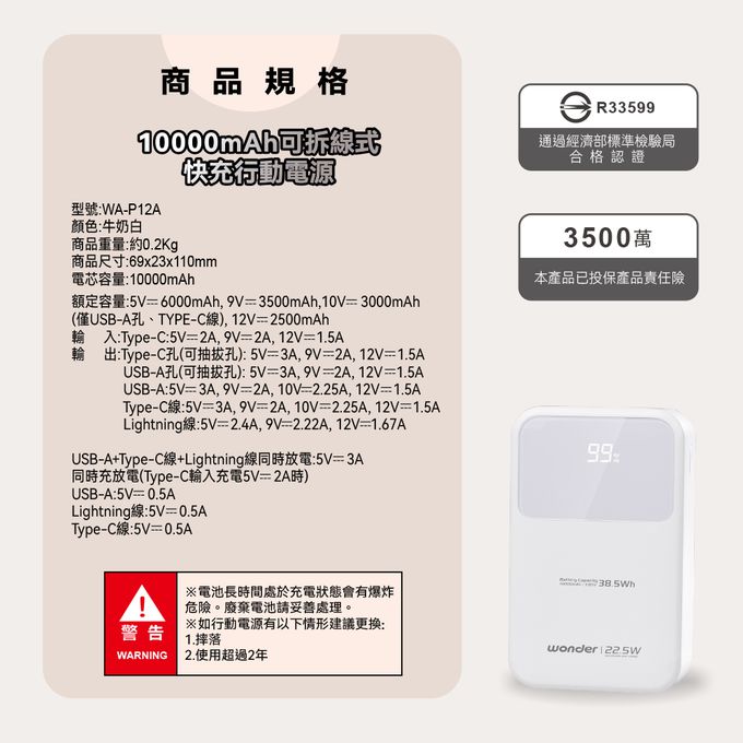 商品重(容)量:10000mAh / 3.85V / 38.5Wh