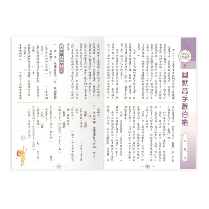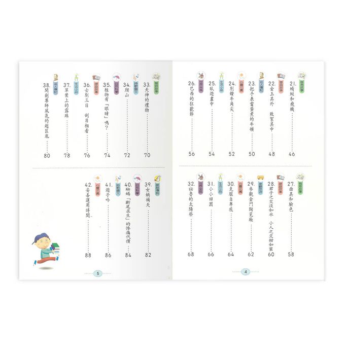 本書特別聘請兒童文學作家編寫,共收錄42篇包含神話.童詩.科學.名人傳記等不同類型的主題文章,題材既豐富又廣泛.每一篇文章不但附有閱讀測驗,還有疊字 練習.成語接龍.選詞填寫等,活潑的題型可以刺激孩子靈活思考,提升語文能力.