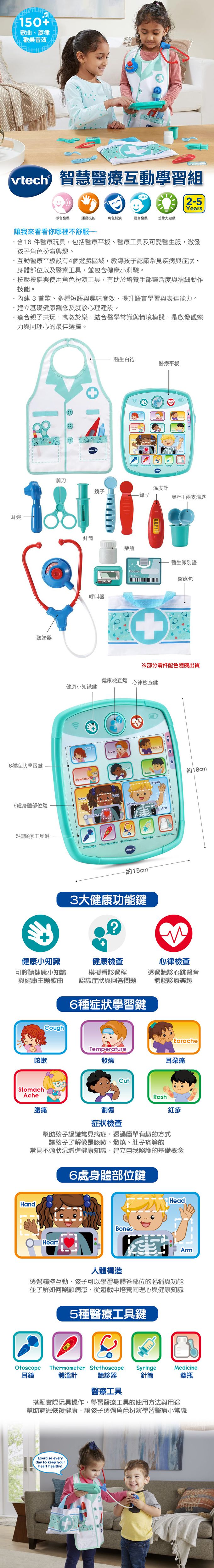 ‧互動醫療平板設有4個遊戲區域,教導孩子認識常見疾病與症狀、身體部位以及醫療工具,並包含健康小測驗。