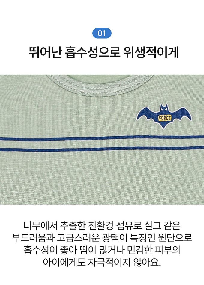 (01.) 原料萃取自樹木,材質天然環保,色澤柔和、質地細膩柔軟有光澤,自帶高級感。吸水性極佳、材質不刺激,容易流汗、有敏感肌的寶貝皆可放心穿著