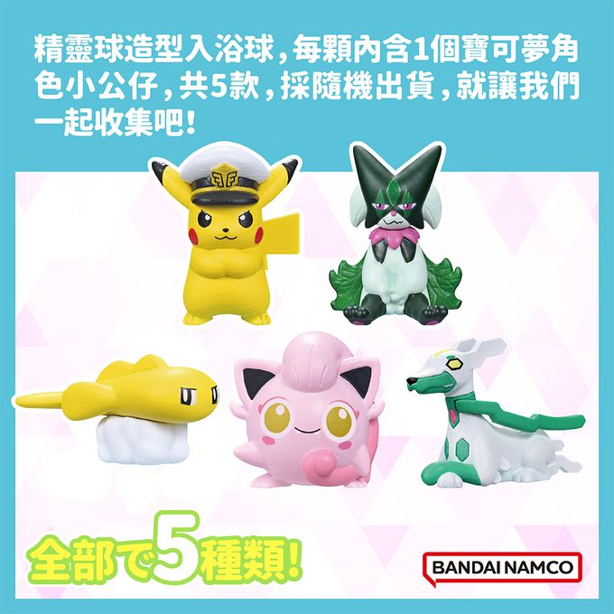 精靈球造型入浴劑,每顆內含1個寶可夢角色小公仔,將入浴球放入水中溶化後,小公仔就會浮出水面喔!共有船長皮卡丘、魔幻假面喵、米立龍、吼叫尾及基格爾德等五款寶可夢,採隨機出貨,就讓我們一起收集吧!