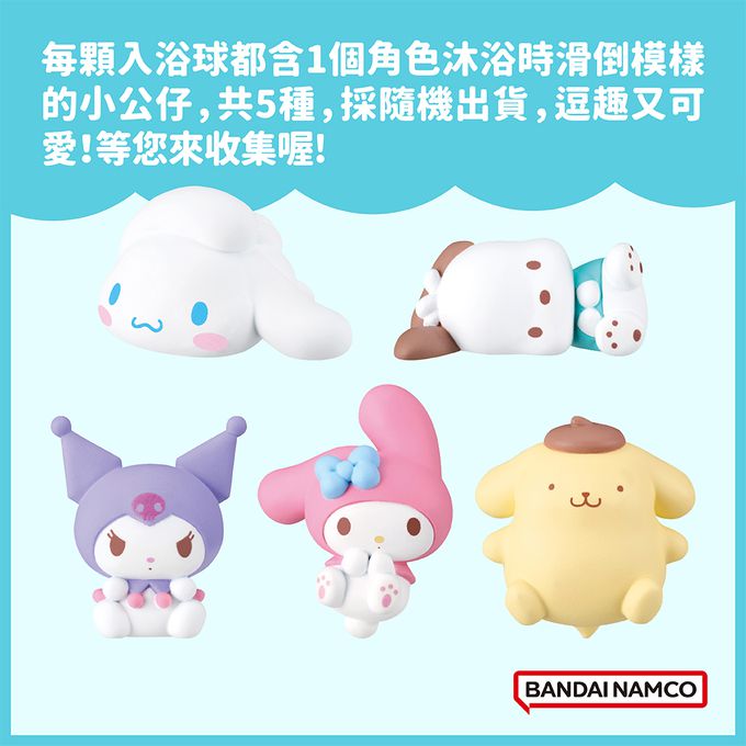 每顆入浴球都含1個角色沐浴時滑倒模樣的小公仔,共5種,採隨機出貨,