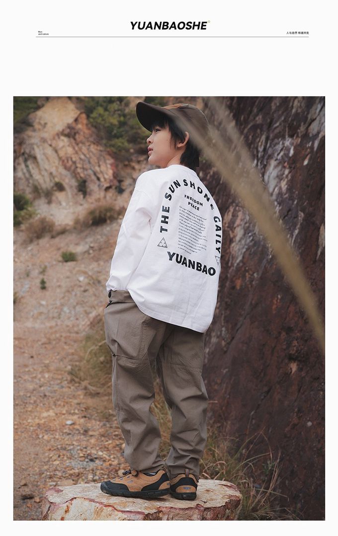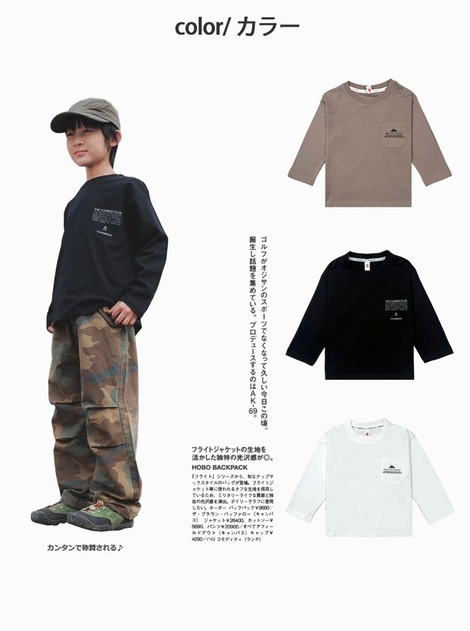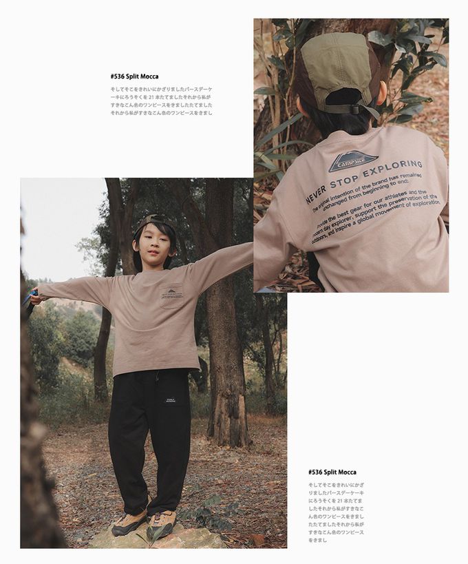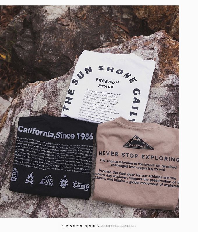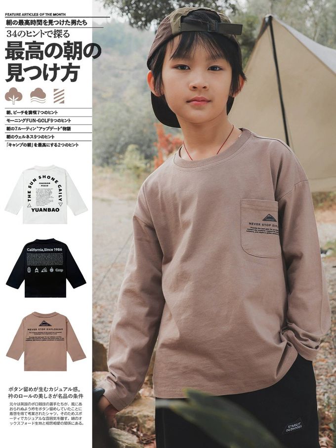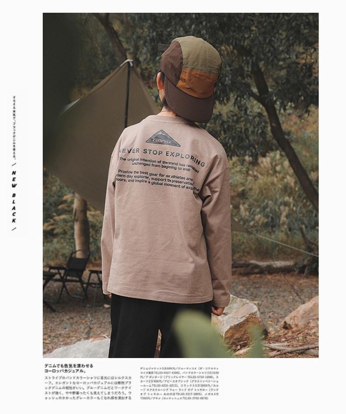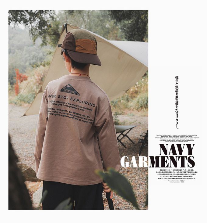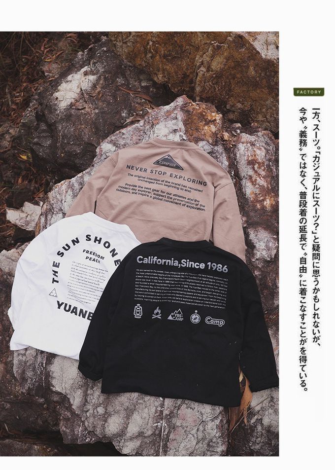Y B S - 純棉圓領長袖上衣-一起去露營-拼袖杏