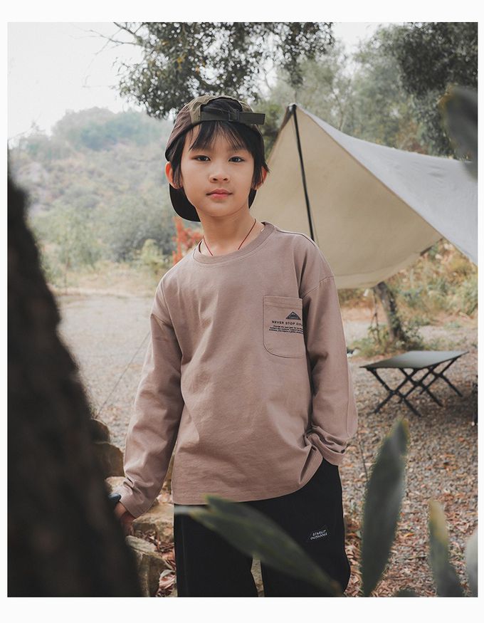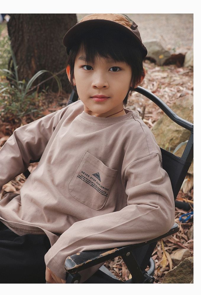 純棉圓領長袖上衣-前口袋後文字印花-卡其