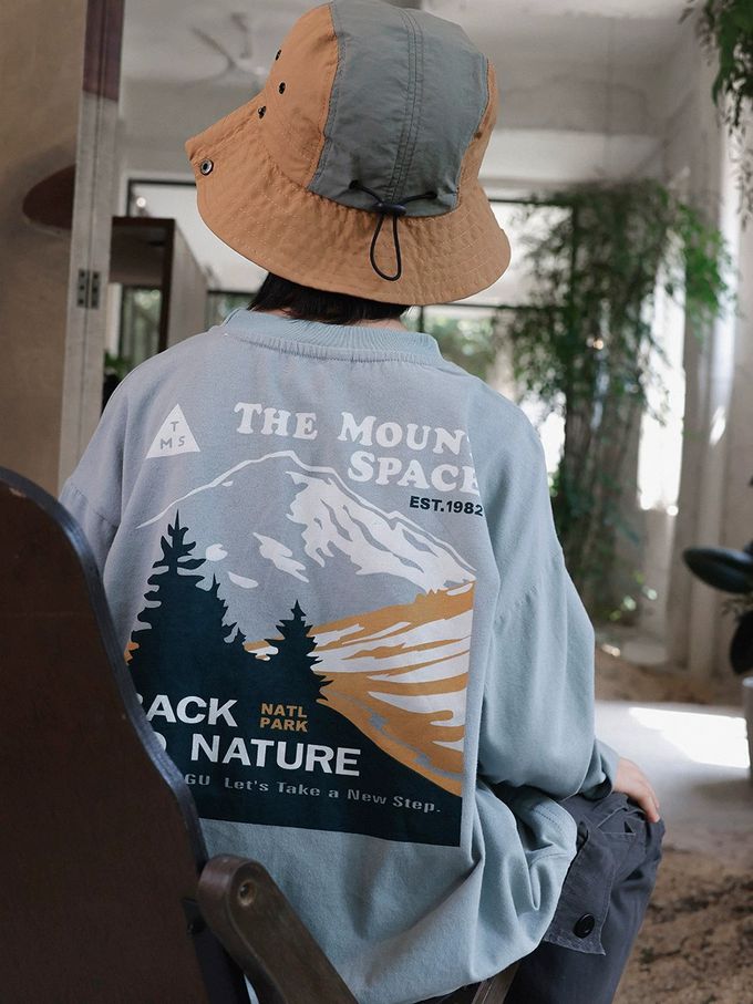 純棉圓領長袖上衣-撞色山脈-灰綠
