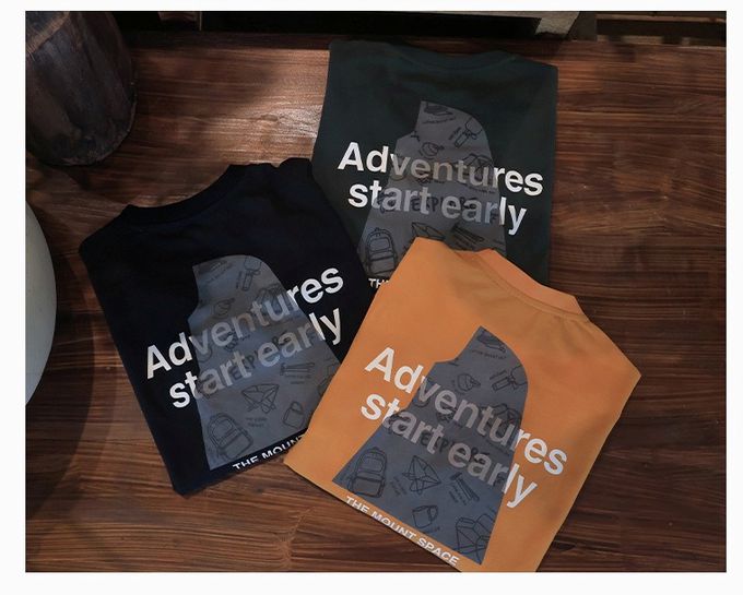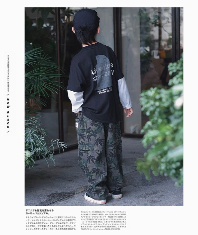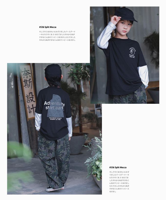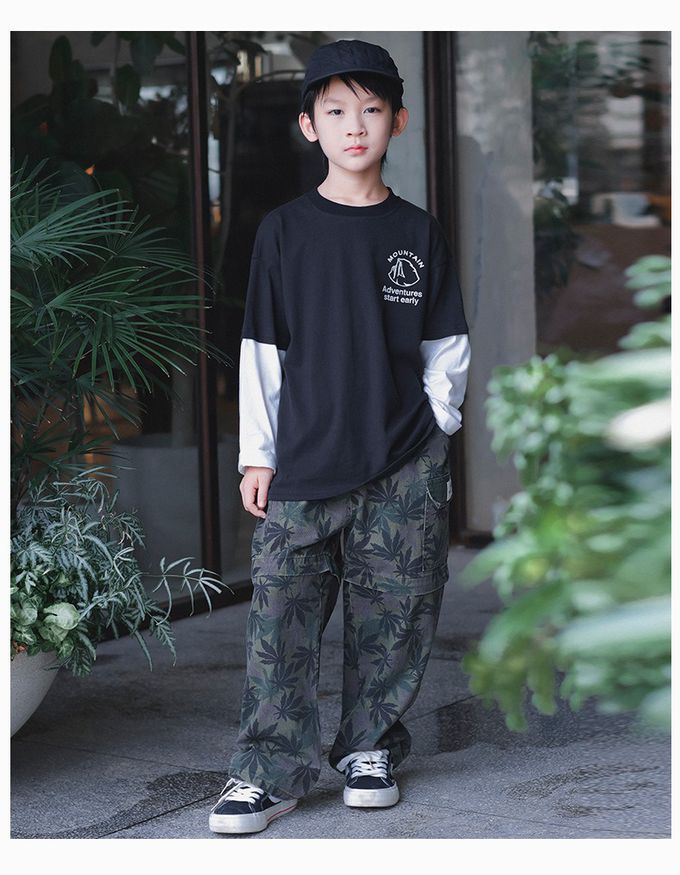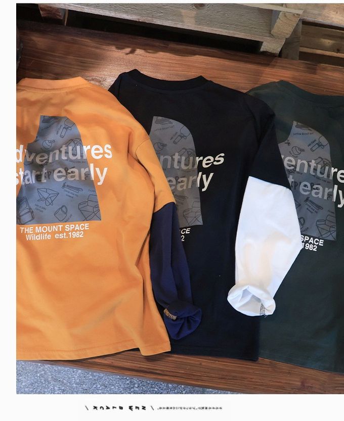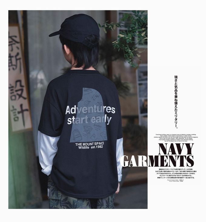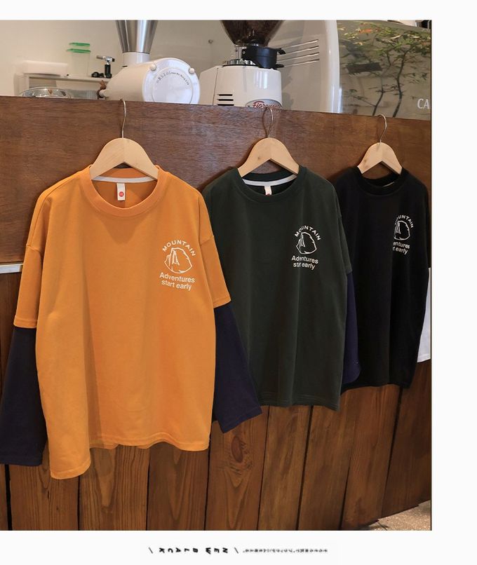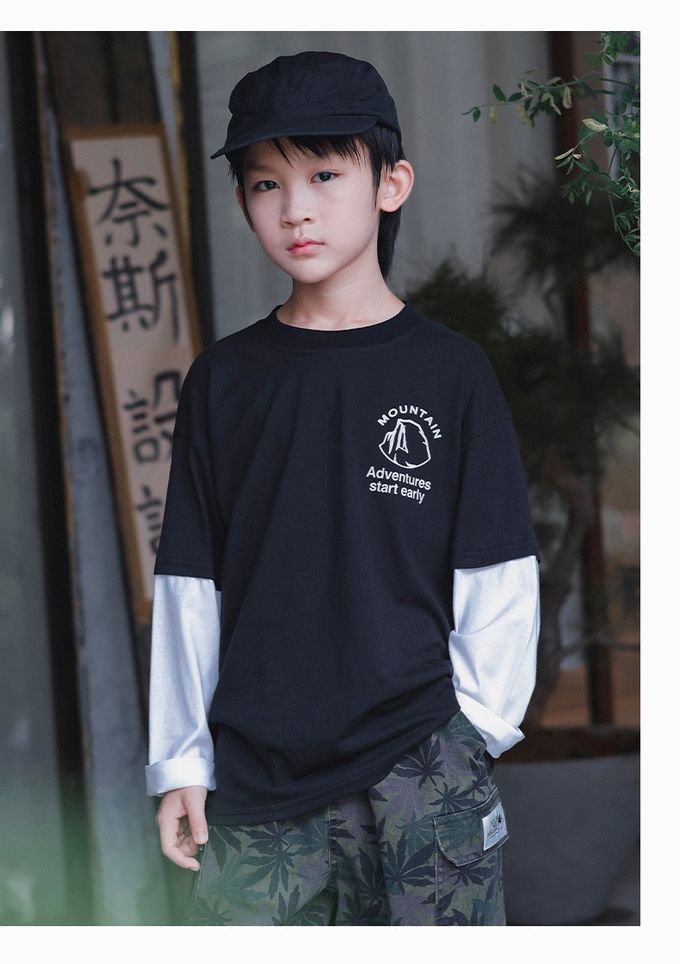 Y B S - 純棉圓領假兩件長袖上衣-山系圖騰-黑色