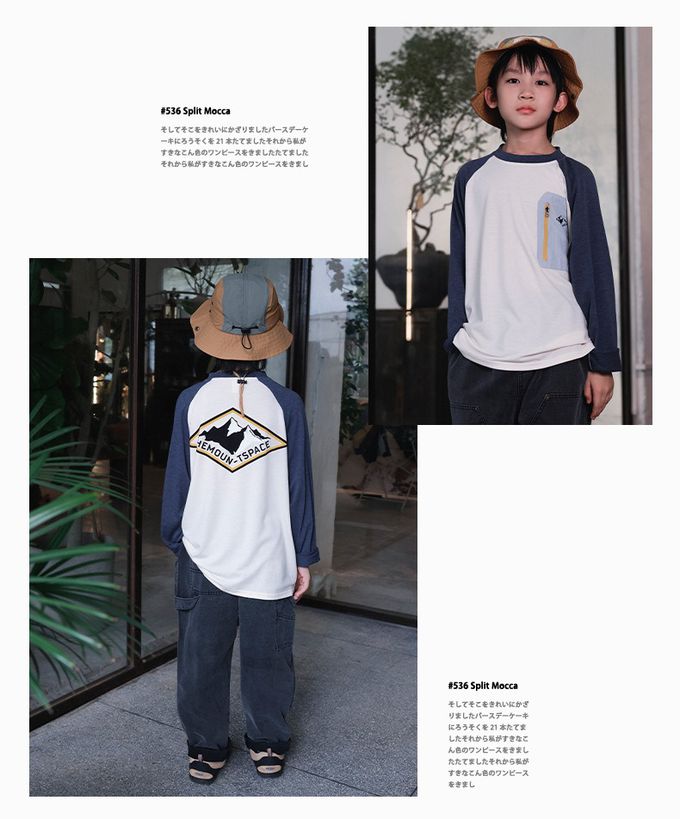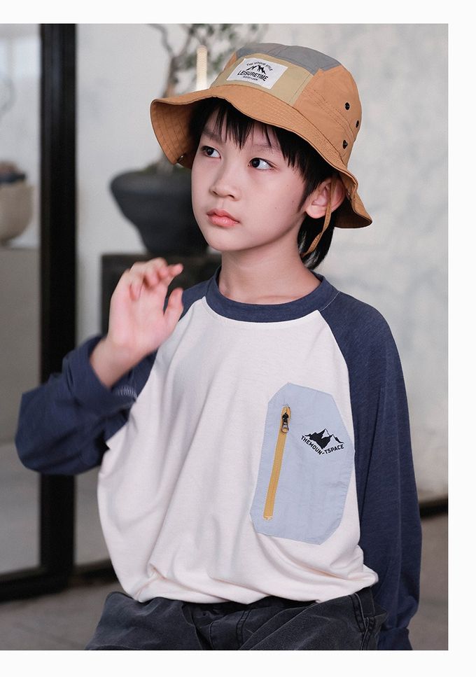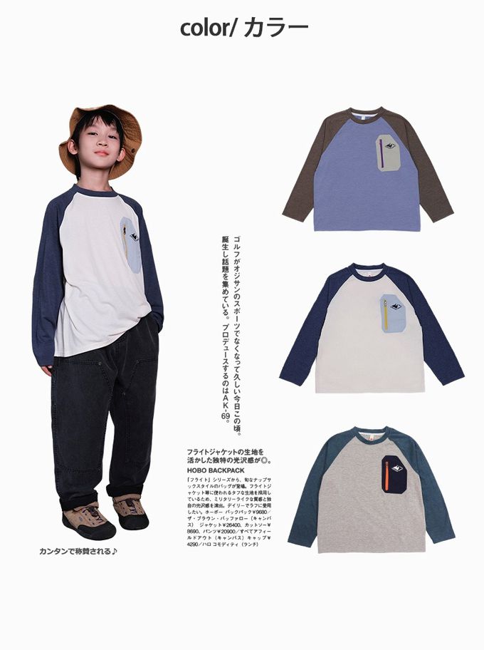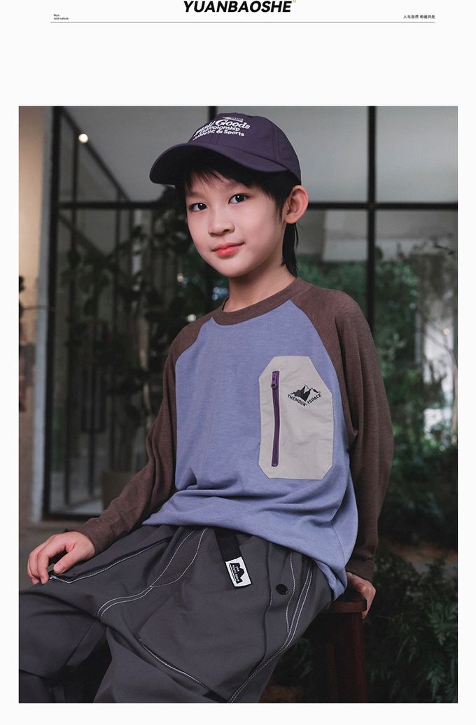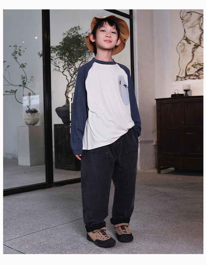 棉質圓領長袖上衣-撞色口袋-拼袖杏