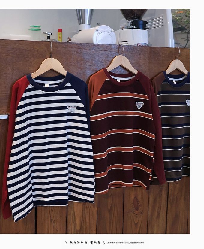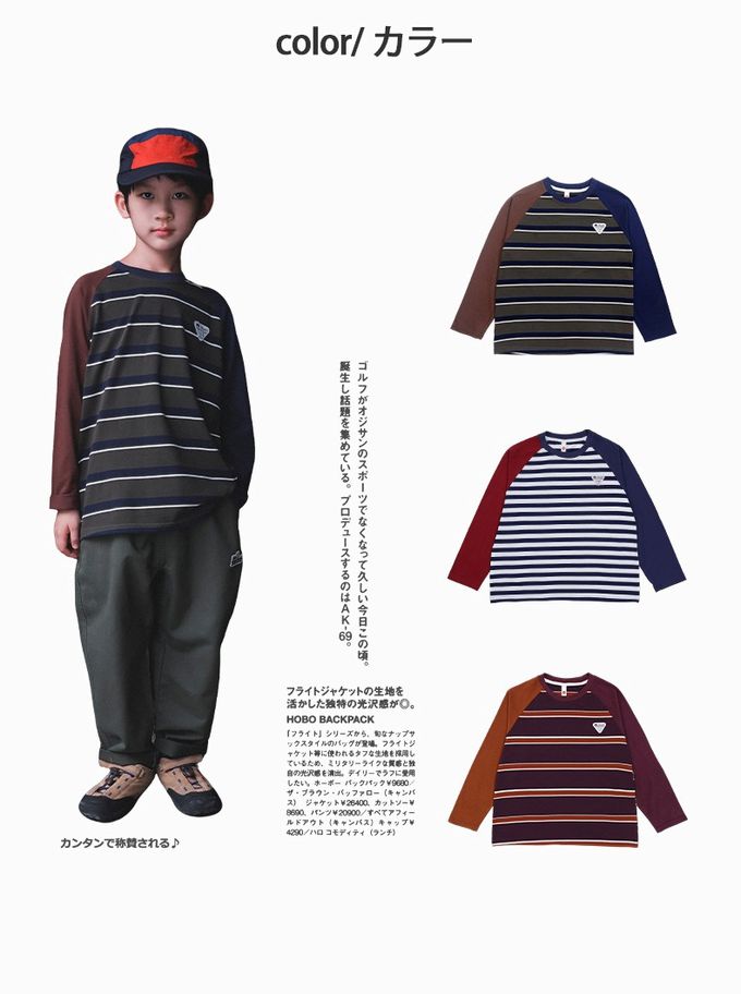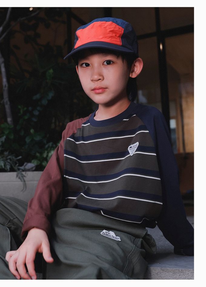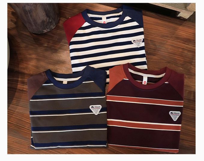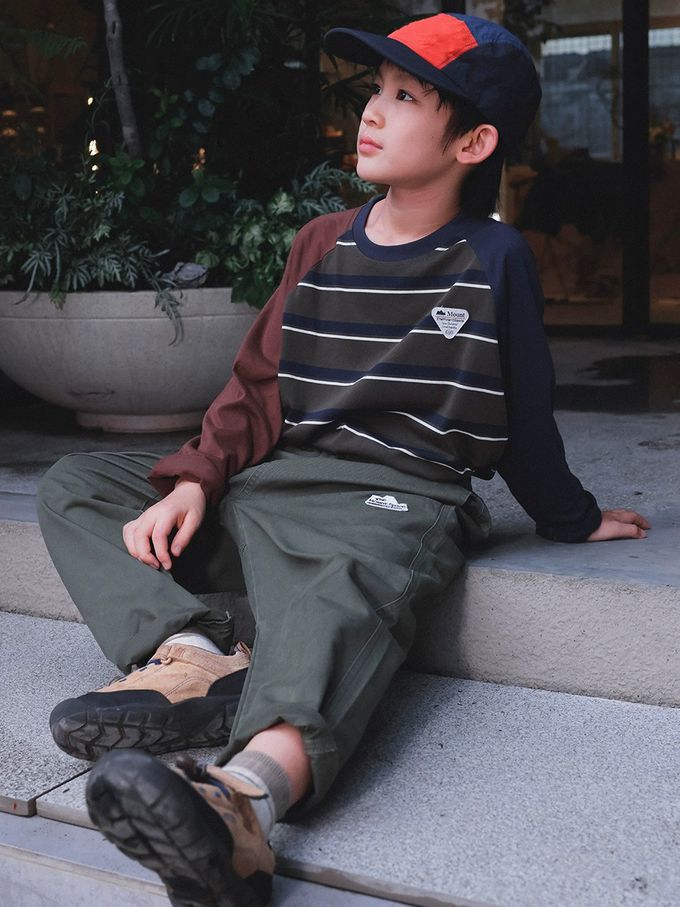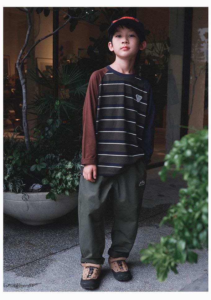 棉質圓領長袖上衣-條紋拼色袖-軍綠
