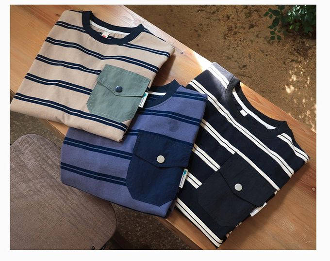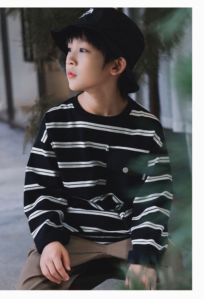 純棉圓領長袖上衣-設計口袋-黑白條紋