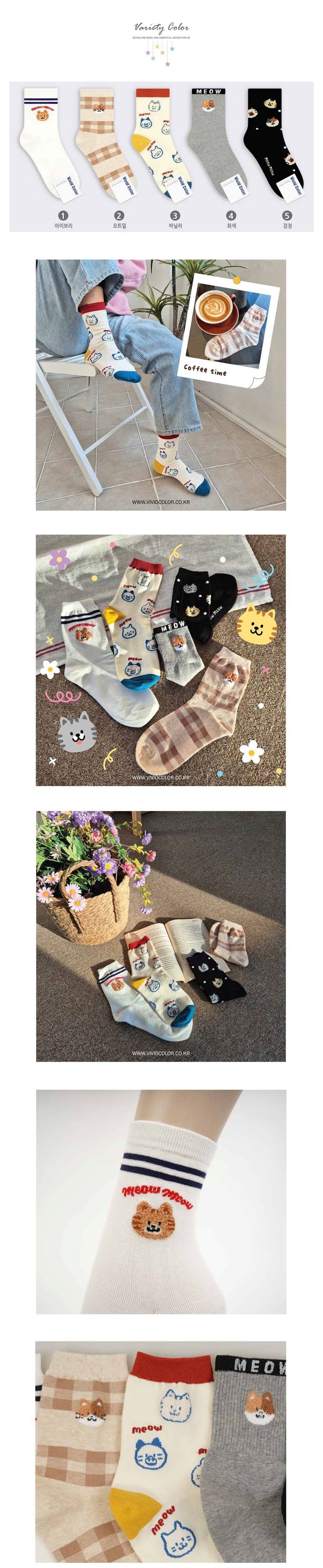 韓國連線 - 韓製動物毛巾繡彈性中筒襪-貓咪 (23-25cm)-5雙,全花色各1