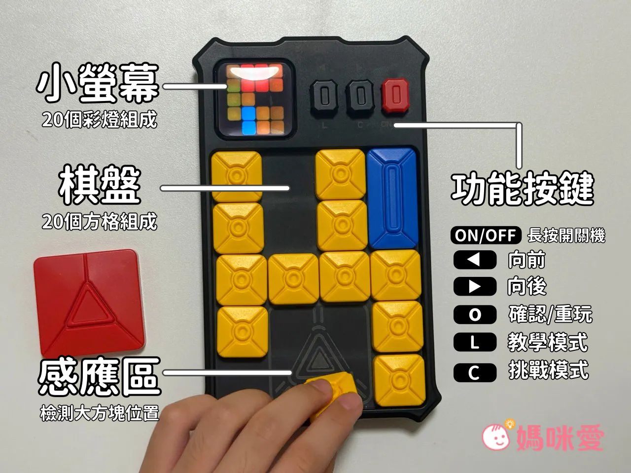 目標:將大方塊從不同開局位置移到棋盤底部感應區即可通關!(會自動進入下一關)