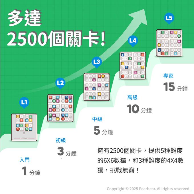 多達2500個關卡!提供5種難度的6x6數獨(六宮格),和3種難度的4x4數獨(四宮格),挑戰無窮!