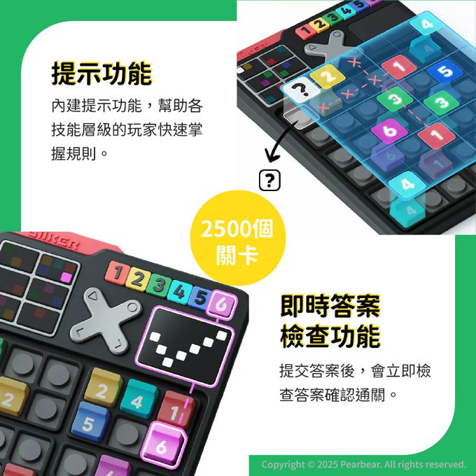 成功通關:全部答案填完並通過驗證後,會播放通關動畫&通關使用時間,請清空棋盤後再短按『>鍵』進入下一題。