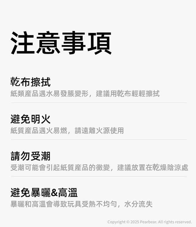 注意事項:為維護兒童安全,請在成人監督下使用,本玩具內 含小物件,有銳邊或尖端,或者兩者皆有,不適合 未滿3歲兒童使用,且應避免吞食造成窒息。為避 免嬰兒或兒童產生窒息之危險,請於拆卸後,立即 將塑膠袋遠離嬰兒及兒童。請遠離火源。
