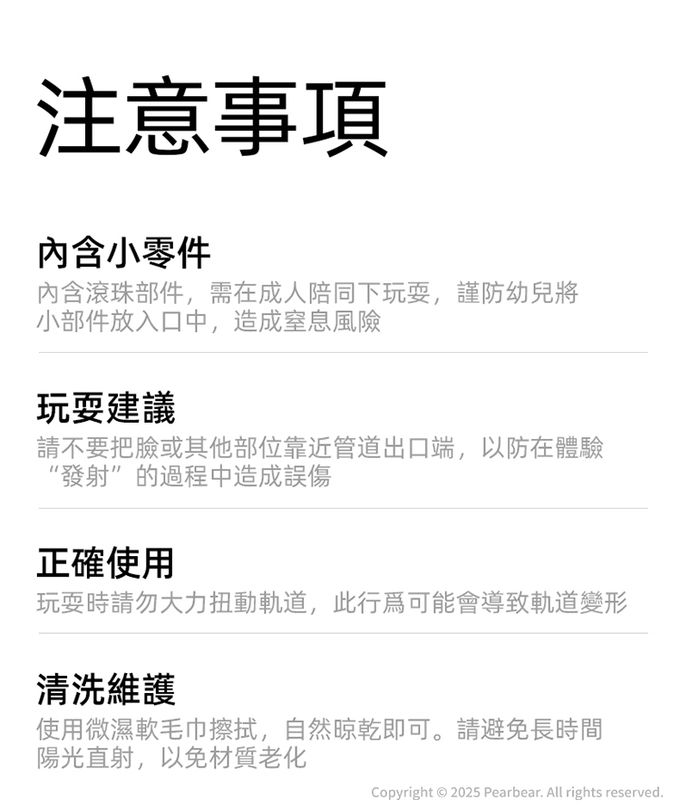 注意事項:為維護兒童安全,請在成人監督下使用,本玩具內 含小物件,有銳邊或尖端,或者兩者皆有,不適合 未滿3歲兒童使用,且應避免吞食造成窒息。為避 免嬰兒或兒童產生窒息之危險,請於拆卸後,立即 將塑膠袋遠離嬰兒及兒童。請遠離火源。
