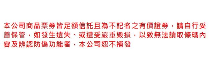 ★本公司商品票券皆足額信託且為不記名之有價證券,請自行妥善保管,如發生遺失、或遭受嚴重毀損,以致無法讀取條碼內容及辨認防偽功能者,本公司恕不補發