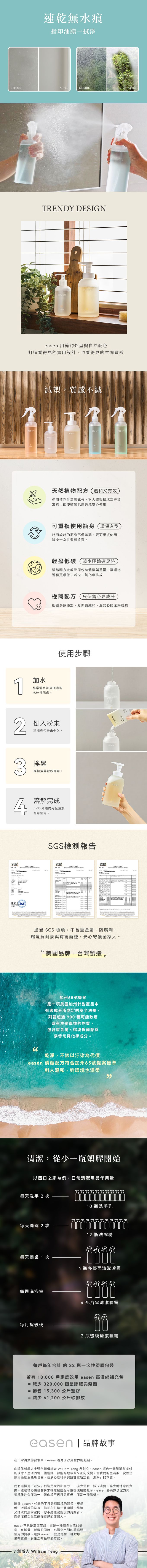 Easen 植萃循環浴室清潔噴霧 ,使用椰子油天然來源潔淨因子結合檸檬酸與草酸,