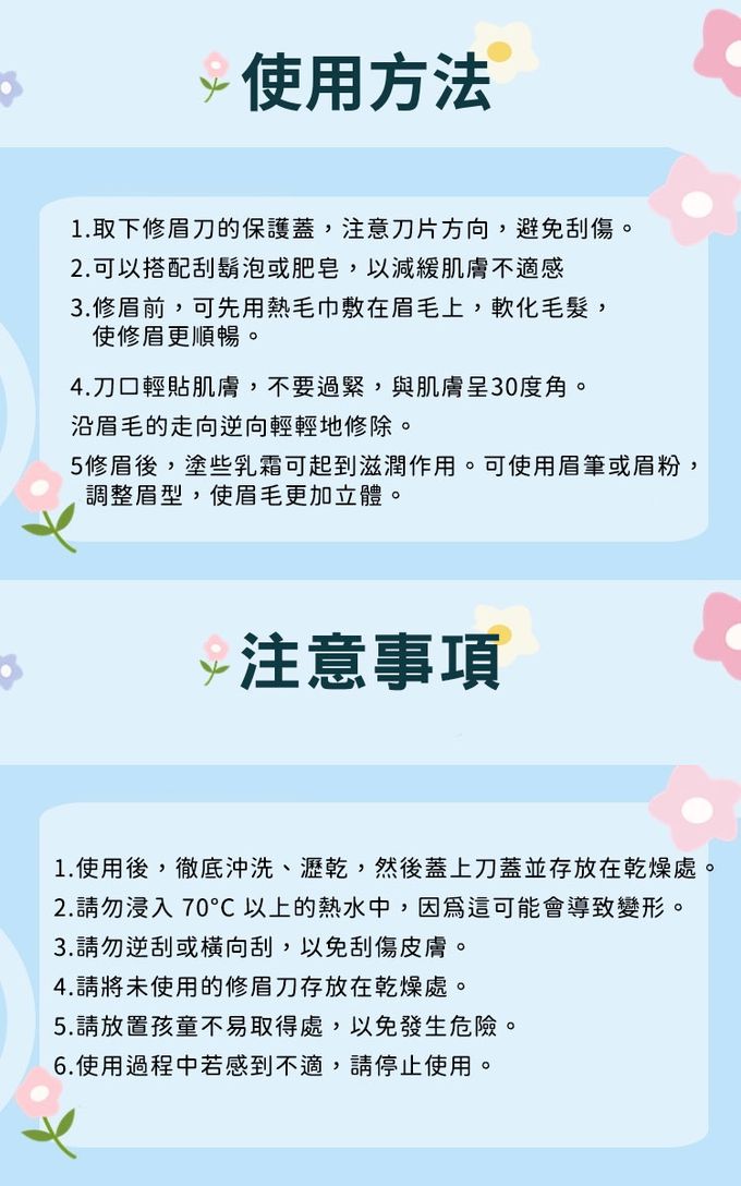 注意事項:1.商品到貨享鑑賞期之權益,鑑賞期並非試用期,辦理退貨商品必須是全新狀態且紙箱及商品配件包裝須完整。商品一經使用或組裝後,恕無法辦理退換貨 2.網頁商品會因面板螢幕解析度不同,造成圖片顏色呈現略有不同,請以實品顏色為準 3.商品為人工丈量略有1~3公分內誤差,請以實品為主。 4.商品收到時若有破損或裂痕,請勿使用,並請在24小時內向購買平台反映商品狀況 5.本商品內容不包含擺飾物品 6.請放置於陰涼通風乾燥處,遠離過於潮濕地方 7.請避免兒童拿取危險物品 8..使用後,徹底沖洗、瀝乾,然後蓋上刀蓋並存放在乾燥處。 9.請勿浸入 70°C以上的熱水中,因為這可能會導致變形。 10.請勿逆刮或橫向刮,以免刮傷皮膚。 11.使用過程中若感到不適,請停止使用。